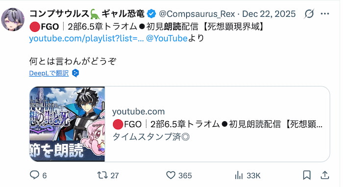 とくにFGO関連の再生リストが非常に充実していて、実況者というより、作品を一緒に味わう語り部のような魅力があります。