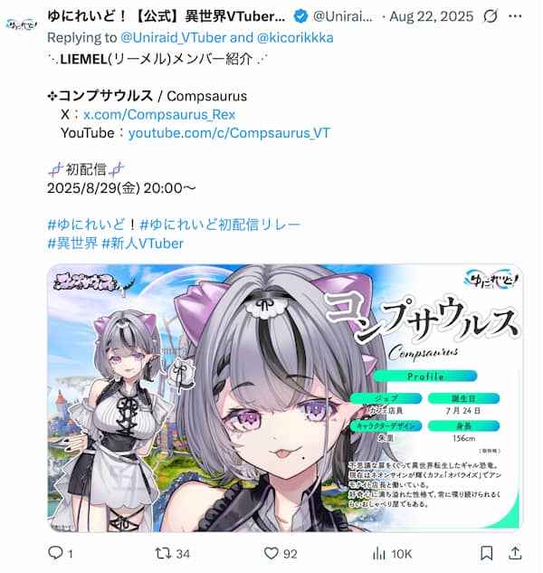 コンプサウルスは、異世界VTuberプロジェクト「ゆにれいど!」の第3ギルド、LIEMELの一員です。