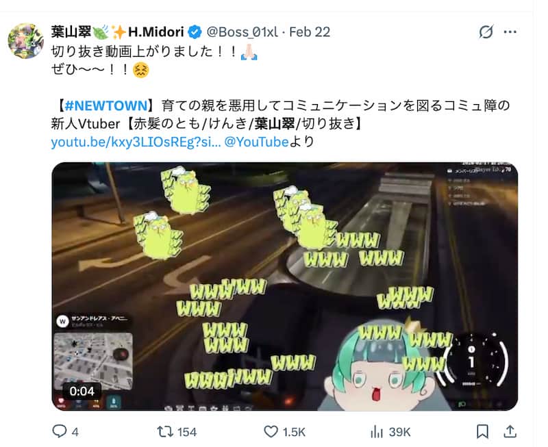 切り抜き動画のタグは「#葉山伐採」という面白いネーミングで、「葉山」を「伐採(木を切る)」するという言葉遊びが笑えます。