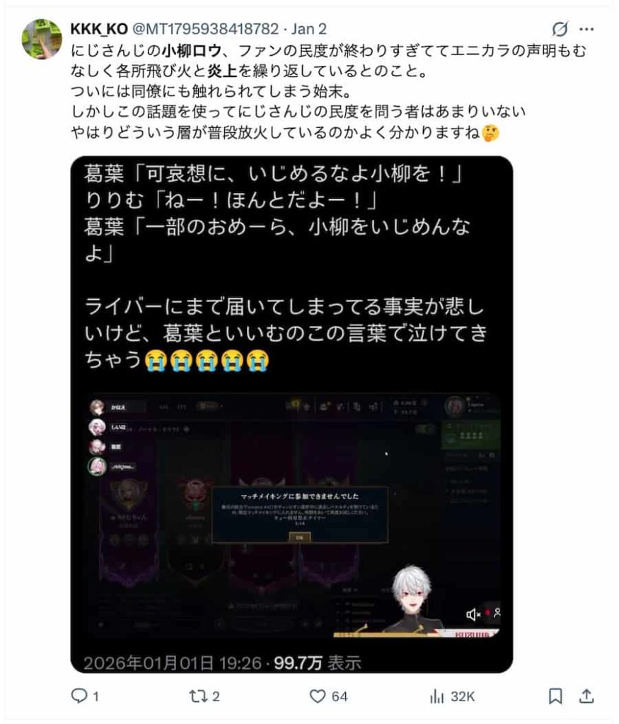 VTuber活動において避けて通れないのが「炎上」やトラブルの話題ですが、小柳ロウさんに関しては、本人ではなく一部リスナーの行動が問題視されたことがありました。