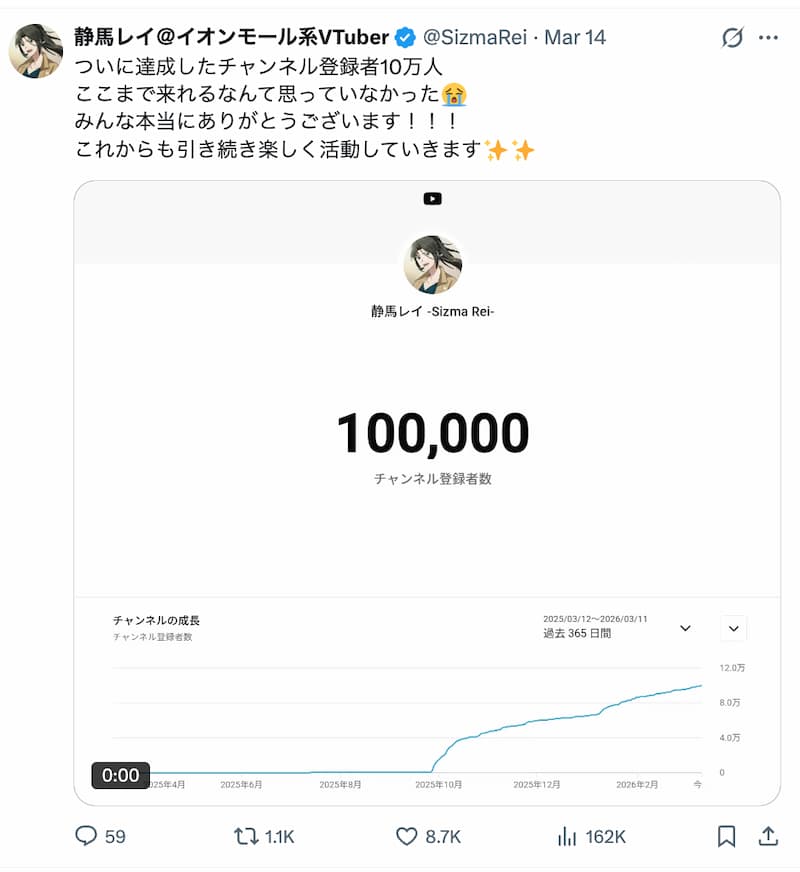 そしてそこから約半年後、2026年3月13日にはチャンネル登録者数が10万人を達成しています。